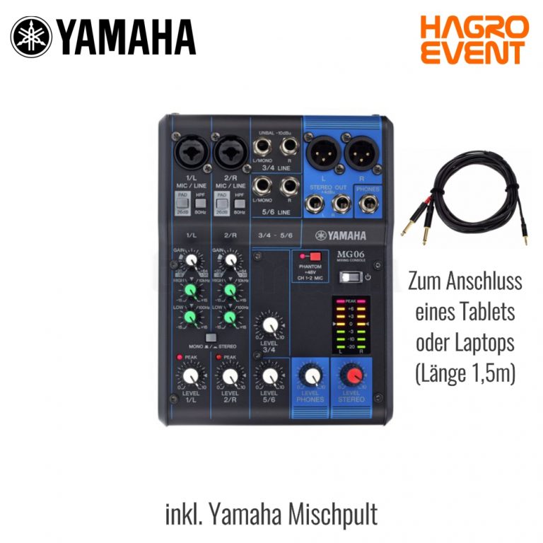 2.1 Lautsprechersystem | 1 x 12 Zoll aktiver Subwoofer und 2 x Säulen-Array mit 4 x 4 Zoll Breitbandtreibern | Mischpult Yamaha MG06 | kann optional zusammen mit dem Mischpult auch mit Bluetooth betrieben werden | Musik für ca. 50-80 Personen (je nach Genre) | inkl. aller zum Betrieb benötigten Kabel und Audiokabel zum Anschluss eines z.B. Laptops